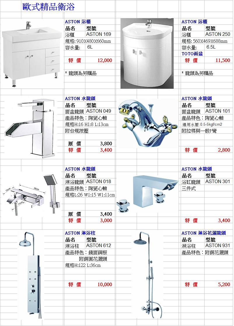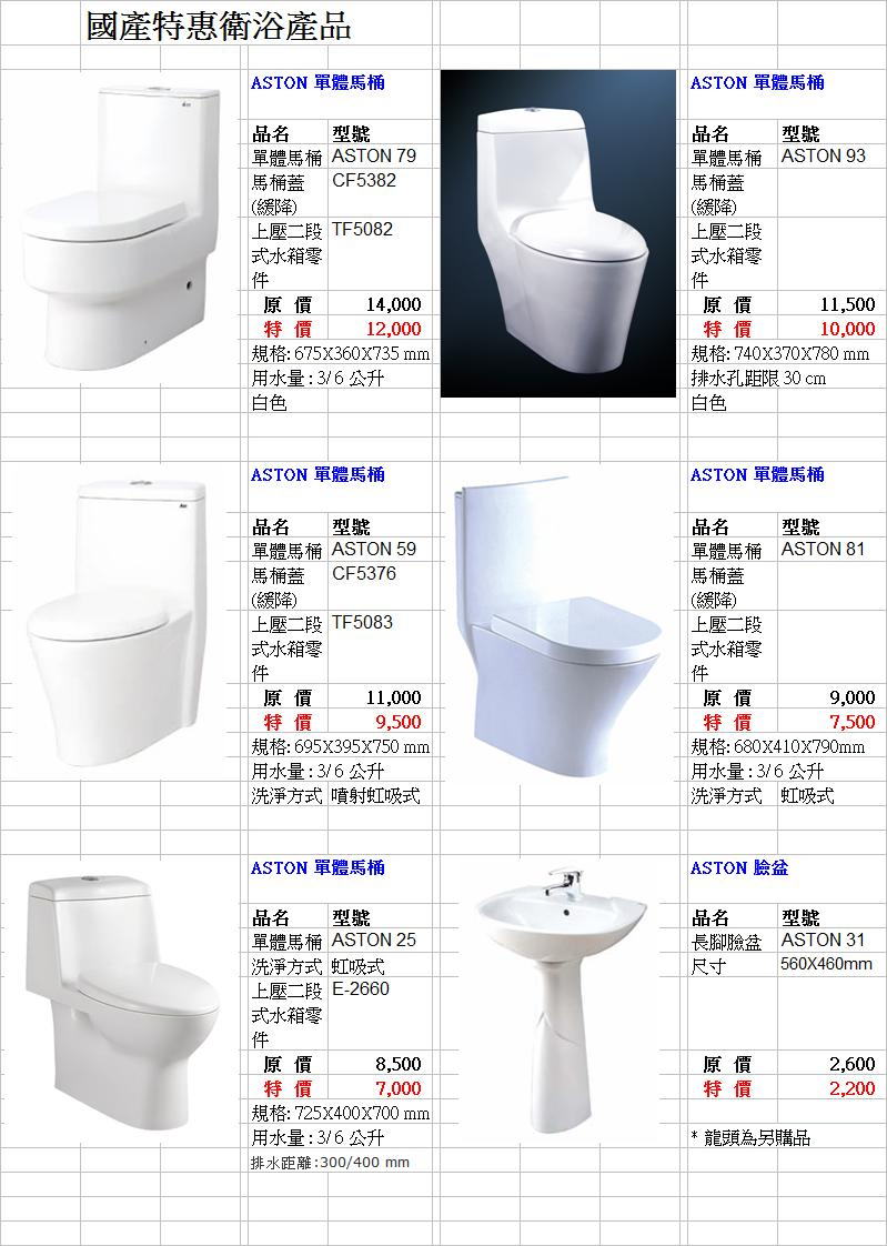 衛浴部份:馬桶、小便斗、面盆、浴櫃、水龍頭、淋浴柱、浴缸、